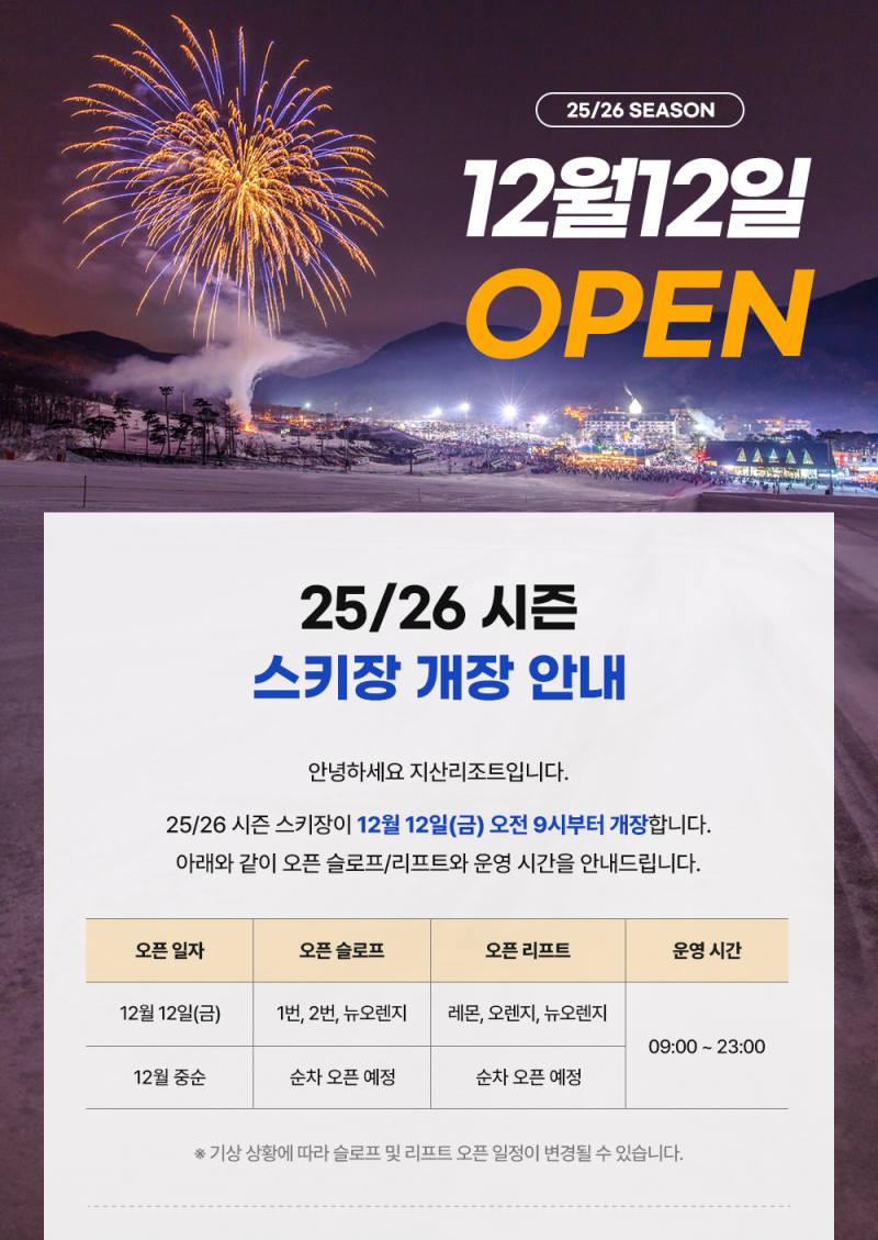드디어 지산리조트 25/26 시즌 개장일이 확정됐습니다!